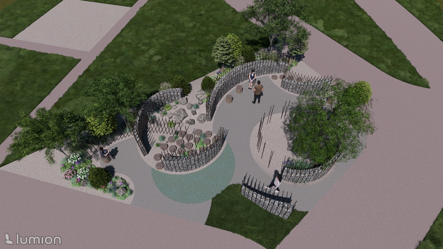 - 중앙 공간 : 곡선형 쇼파를 배치하여 휴식과 체류가 가능한 중심 공간 조성 포장재는 고벽돌을 사용하여 내구성과 안정성 확보